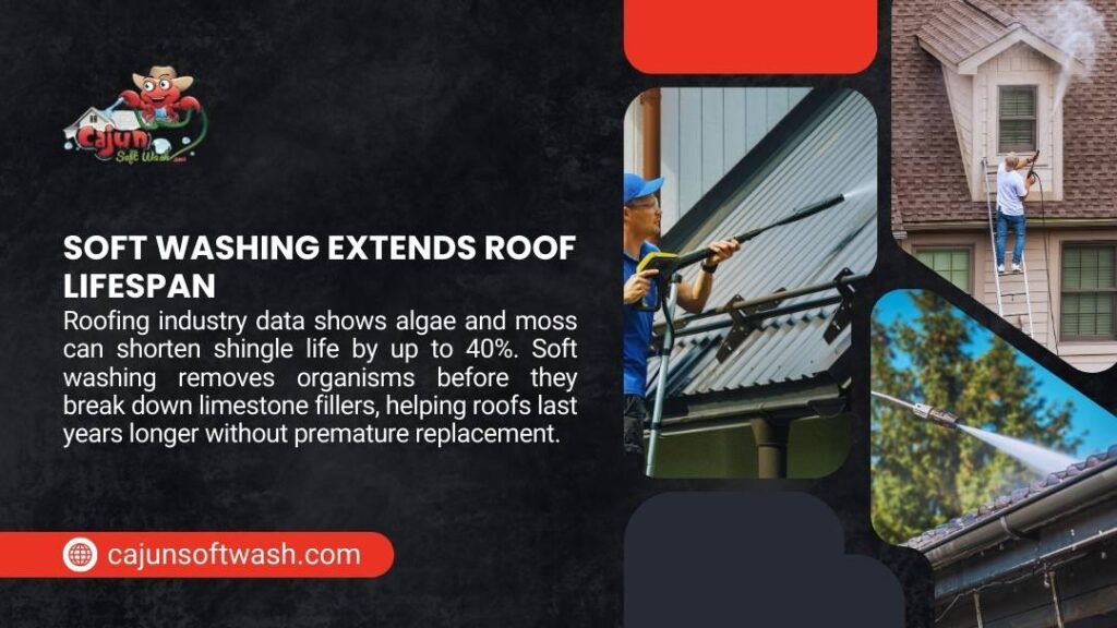 Roofs benefit tremendously from soft washing. The soft wash roof cleaning process extends roof life by removing organisms that break down materials. Many property owners see 5-7 year life extensions from regular cleaning.